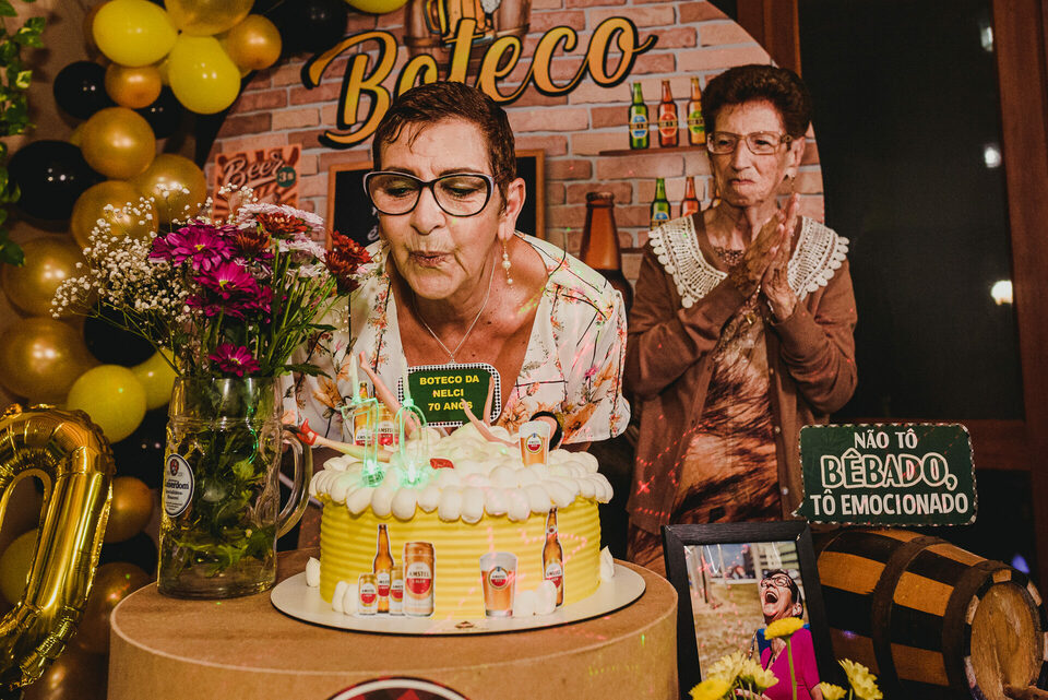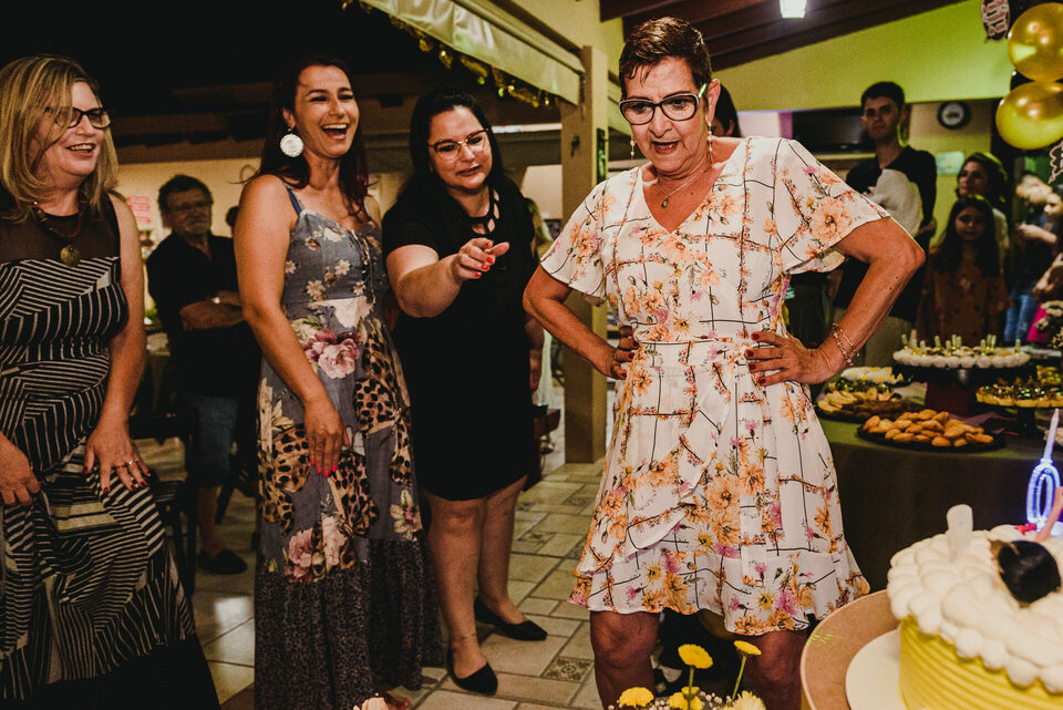 Sugeri pra Nelci fotografarmos antes de ir para o "bar", para ela ter algumas fotos dela neste momento pra lá de importante. Fomos fotografar e utilizamos alguns elementos que contam um pouquinho de como a Nelci é. Terminado o ensaio, combinamos de nos encontrarmos no bar. Saí e fui direto para a casa da Cleo e do Tarcísio. Chegando lá já estavam todos no aguardo dela. Aqueles minutos antes da pessoa chegar em uma festa surpresa sempre são apreensivos. Breu. Frio na barriga. Até que ela finalmente chegou. A emoção se mostrava pelas lágrimas que corriam pela face. A felicidade, no sorriso e no abraço apertado à cada um que lá estava. A Nelci aproveitou, aproveitou como nem sabia que ia aproveitar naquela noite. E o presente dela se realizou: a presença de todos que amava, e o sorriso, em reciprocidade de todos aqueles que ela já havia proporcionado à cada um ali presente.