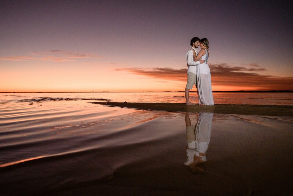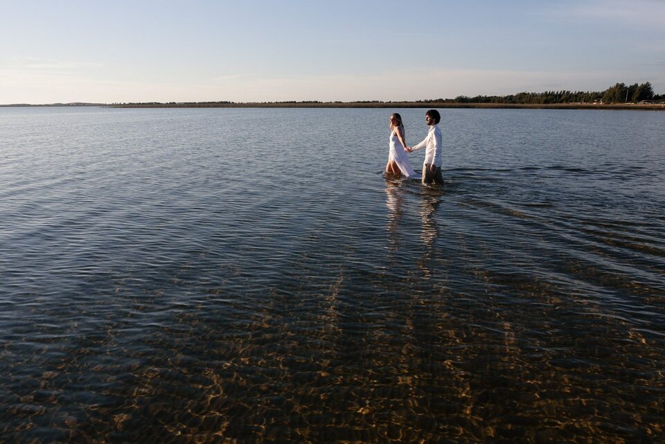 Ficamos apenas na primeira lagoa nesse ensaio, onde é um paraíso! Ela é rasa, onde se podem andar quilômetros e ainda estar com água no joelho. Nos programamos para pegarmos o nascer do sol na primeira lagoa de Bacupari, onde fomos abençoados com uma luz incrível logo nas primeiras horas da manhã. A água, estava quentinha logo que o sol nasceu, e os pássaros cantando. Era cena de filme romântico, sabe? Daqueles onde o amor impera, e, me perdoem os desapegados, mas todo mundo deveria viver um amor assim.