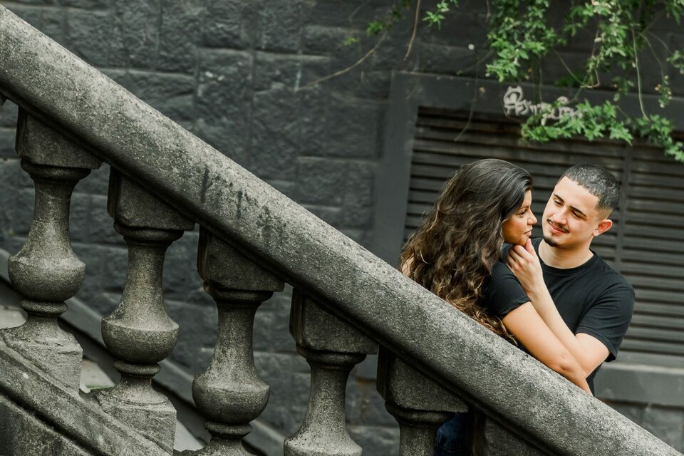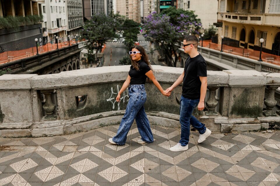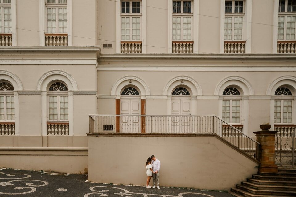 O Pré-wedding deles foi realizado no Centro Histórico de Porto Alegre, onde temos referências mais urbanas e linhas para construir imagens que mostrem todo o sentimento que eles possuem. Afinal, em meio a uma capital tão corrida quanto a nossa, quem diria que tudo isso literalmente para - para os dois - quando olham nos olhos um do outro?
