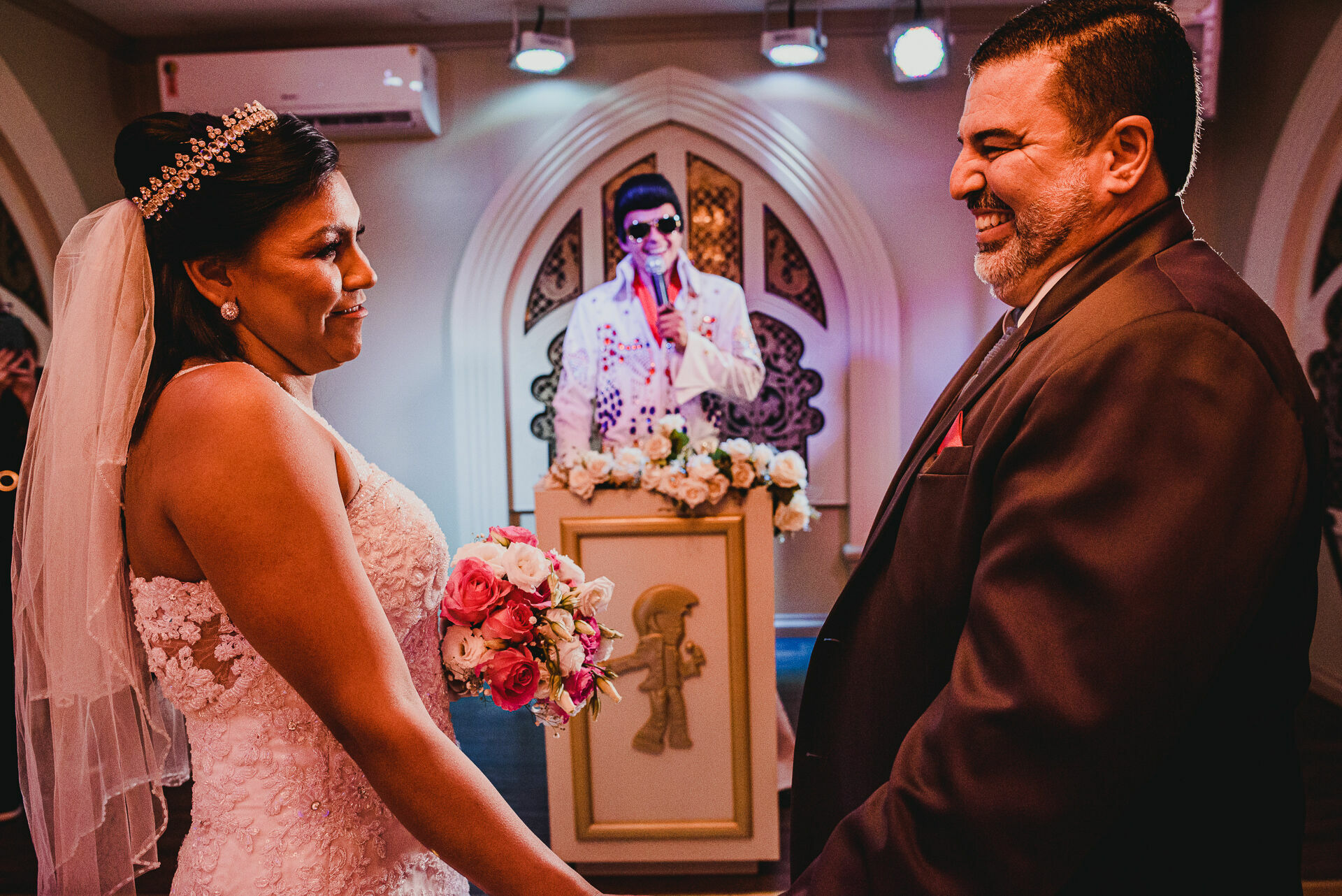 - Express: a cerimônia express Elvis ou Romântico inclui apenas o aluguel do véu e buquê para a noiva, do blazer para o noivo e 1 ator, sendo o mesmo cerimonialista ou fantasiado de Elvis Presley. Tem o custo de R$699,00.