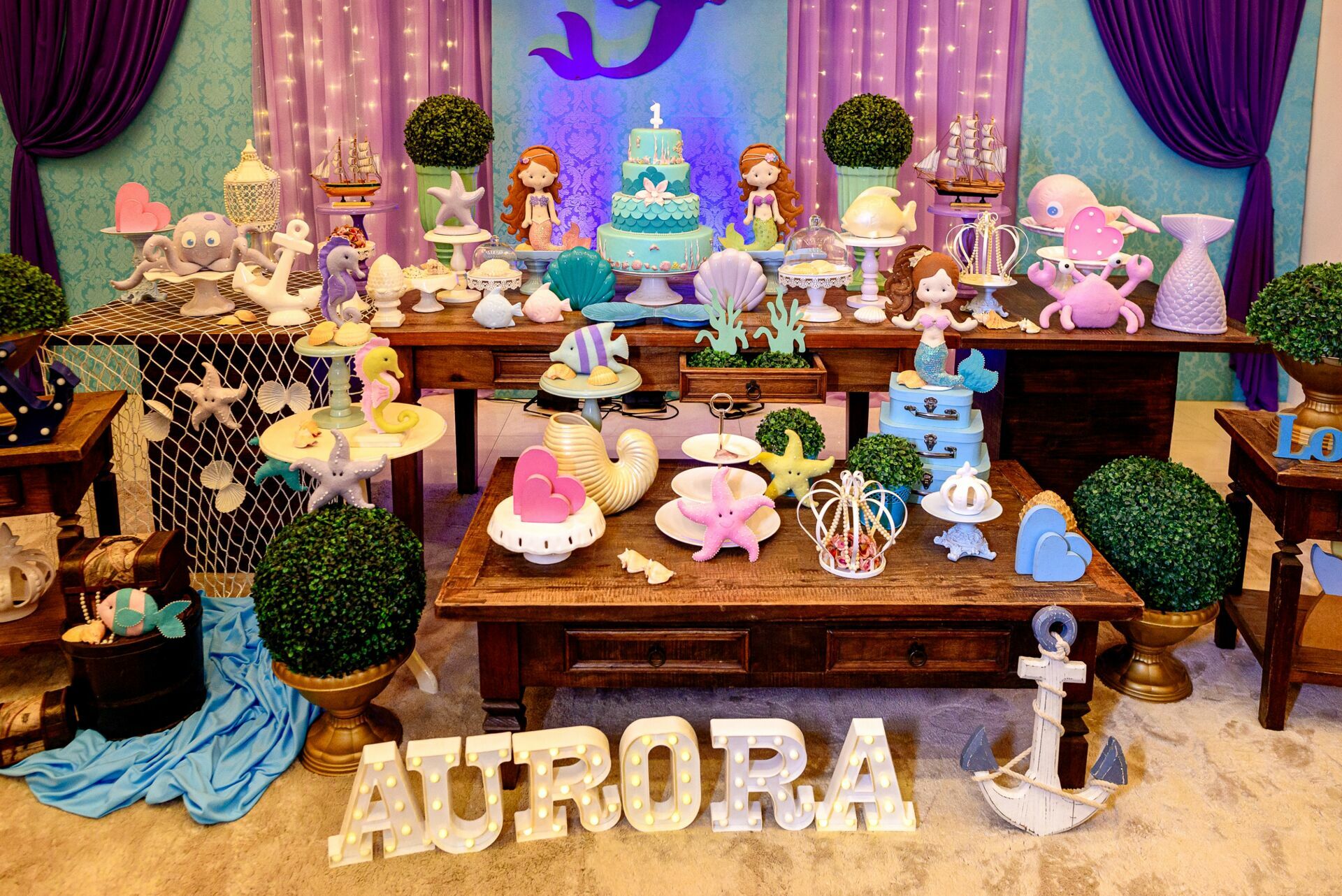 Ao chegar na festa, fiquei maravilhado com a decoração que os pais da Aurora escolheram com tanto carinho. Cada detalhe remetia ao fundo do mar, com conchas, sereias, baús do tesouro e muitos outros elementos mágicos que tornaram o ambiente simplesmente deslumbrante.