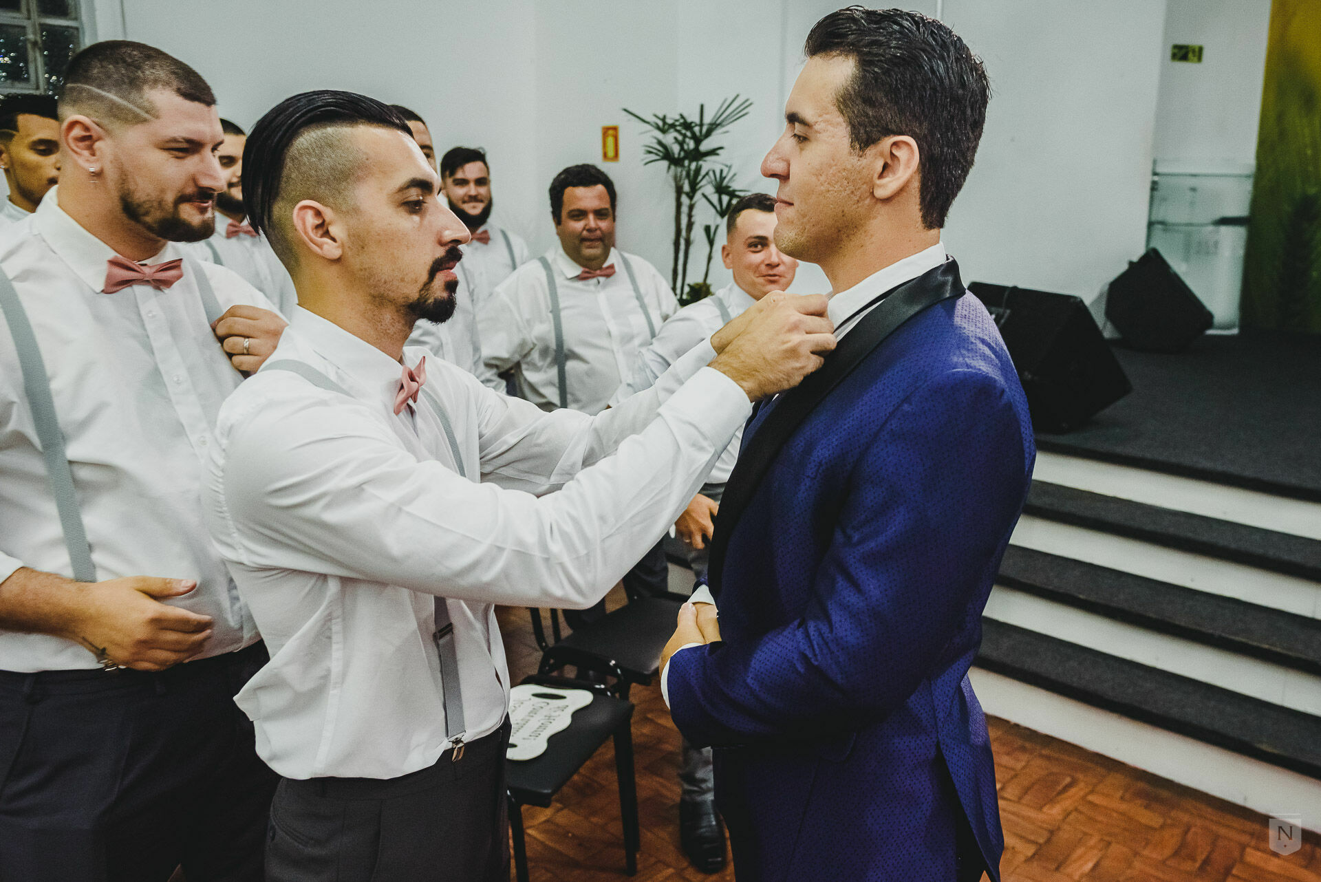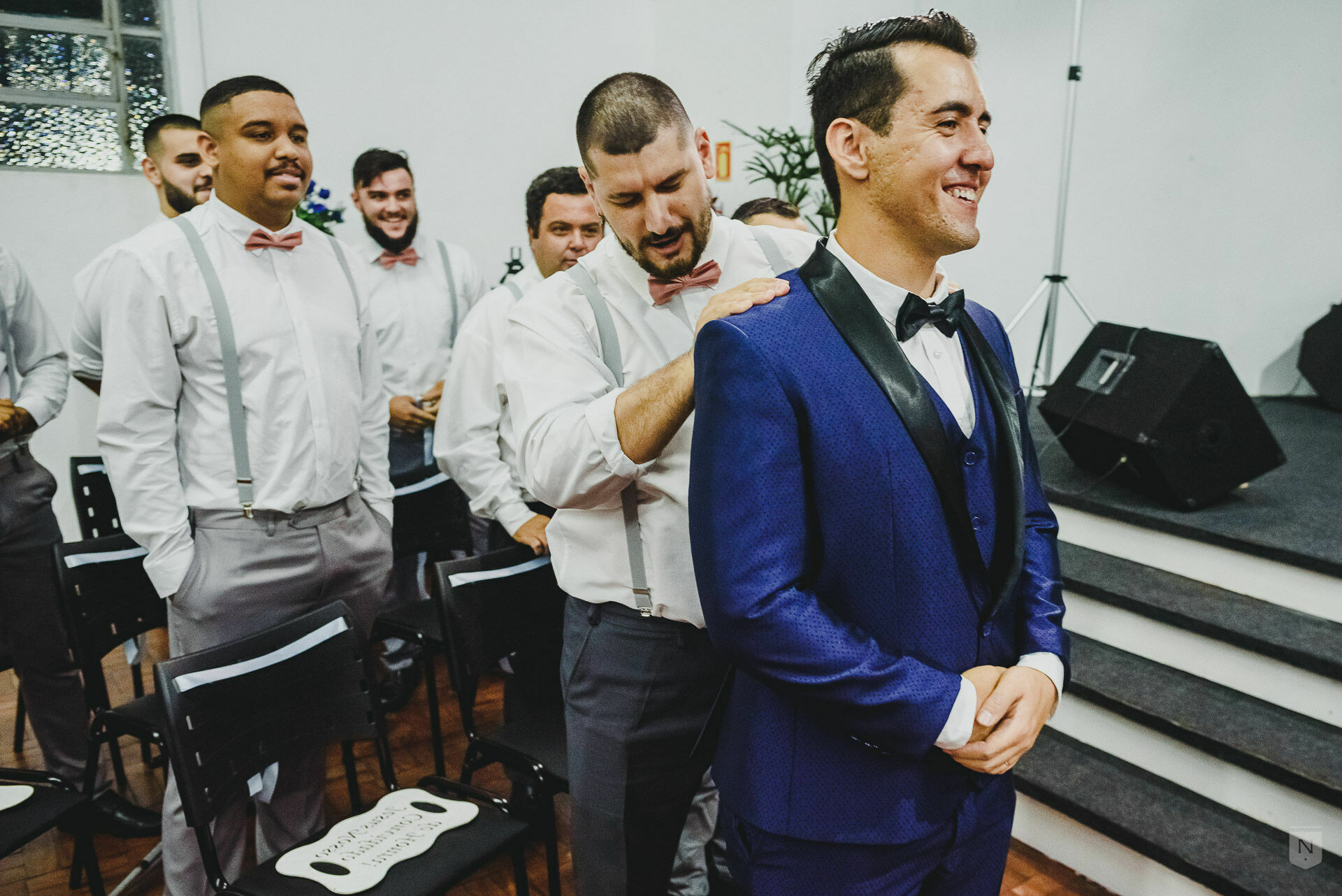 Teve um momento em que os padrinhos antes do tão esperado “pode beijar a noiva” fizeram uma brincadeira com o noivo que deixou todos nós caindo na risada. Todos os padrinhos começaram a arrumar o cabelo, a roupa, o sapato do noivo para esse momento.