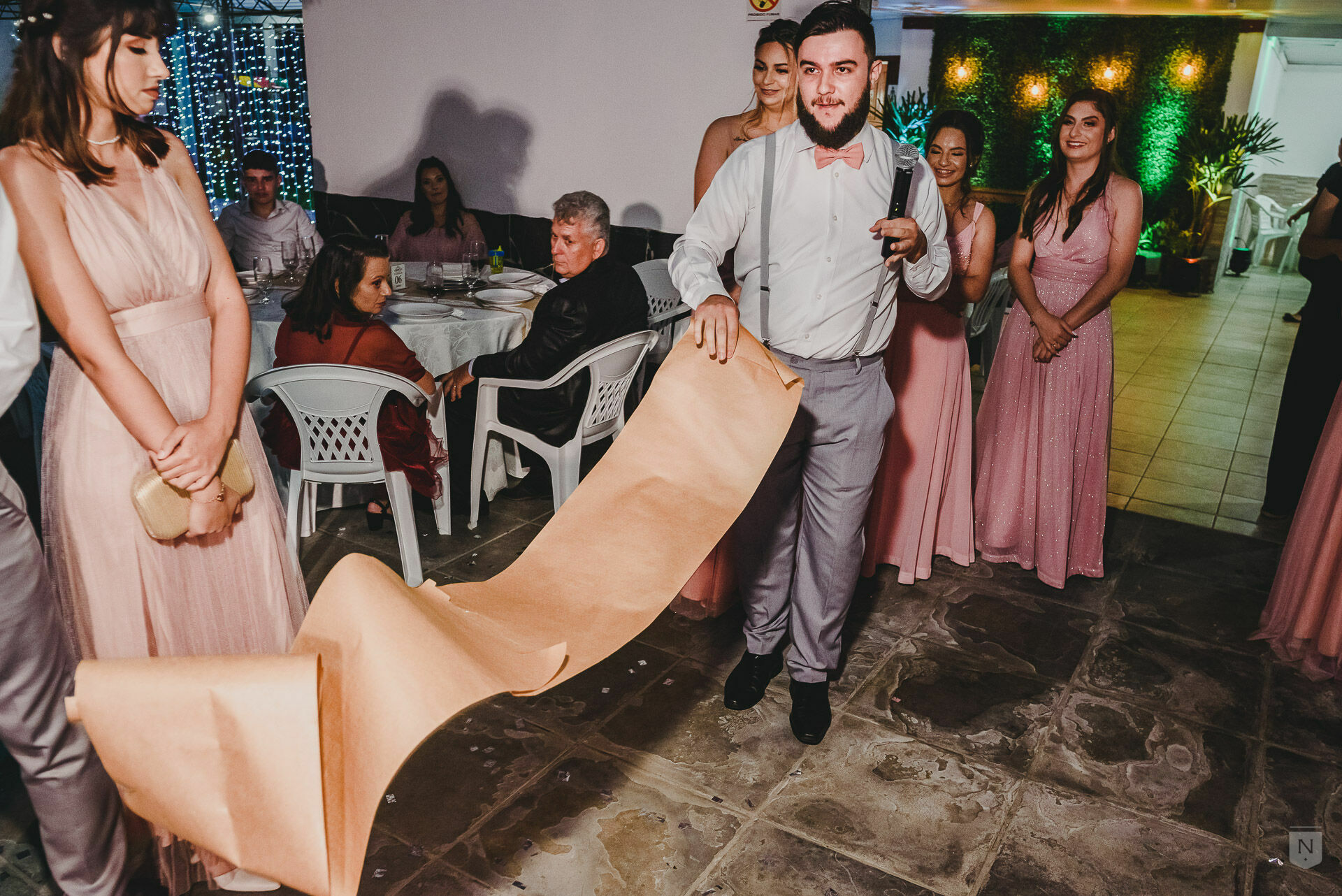 Tivemos alguns discursos dos nossos padrinhos, e se eu pudesse dar uma dica para outros noivos, seria: deixem os padrinhos dizerem algo a vocês. Mesmo que pareça que irá estender o tempo antes do buffet, não deixe passar essa oportunidade. É algo que vai marcar muito a vida de vocês, ouvir as palavras de pessoas queridas nesse momento a respeito do amor de vocês e de toda a trajetória até chegar no casamento. Façam brincadeiras também depois do Buffet. Aproveitem aquele momento! A noite é de vocês, façam uma dança só dos dois, seja pra abrir a pista ou no final, quando todos forem embora, e não esqueçam de curtir com os convidados! Preparem tudo que for especial e faça sentido pra vocês nesse dia, ele passa rápido e a vontade de voltar pra ele é grande, então curtir cada segundo é essencial.