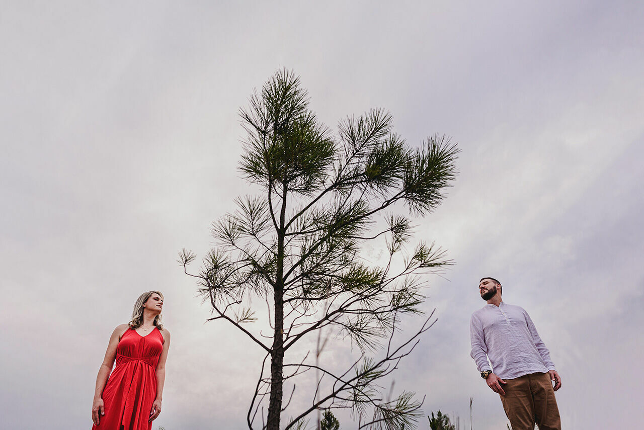 Eu curto muito que minhas noivas usem tons que contrastem com o espaço, como tons de magenta e vermelho para fotos no campo, onde a predominância são tons de verde. Também acho incrível tons suaves e vestidos fluidos com texturas no próprio tecido, criando relevos suaves e dinamismo na foto!