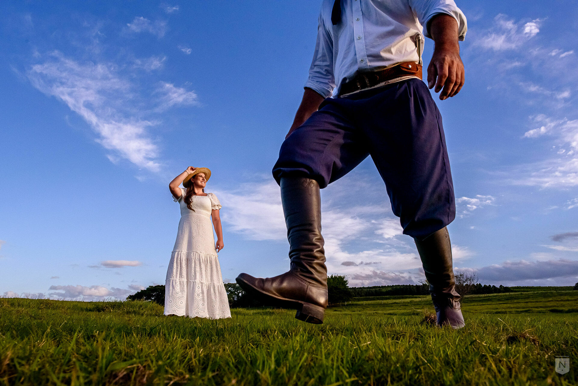 Roupas leves e de tons claros criam um bonito contraste em ensaios no campo, podendo também substituir o look feminino por um vestido leve e claro (não necessariamente branco)